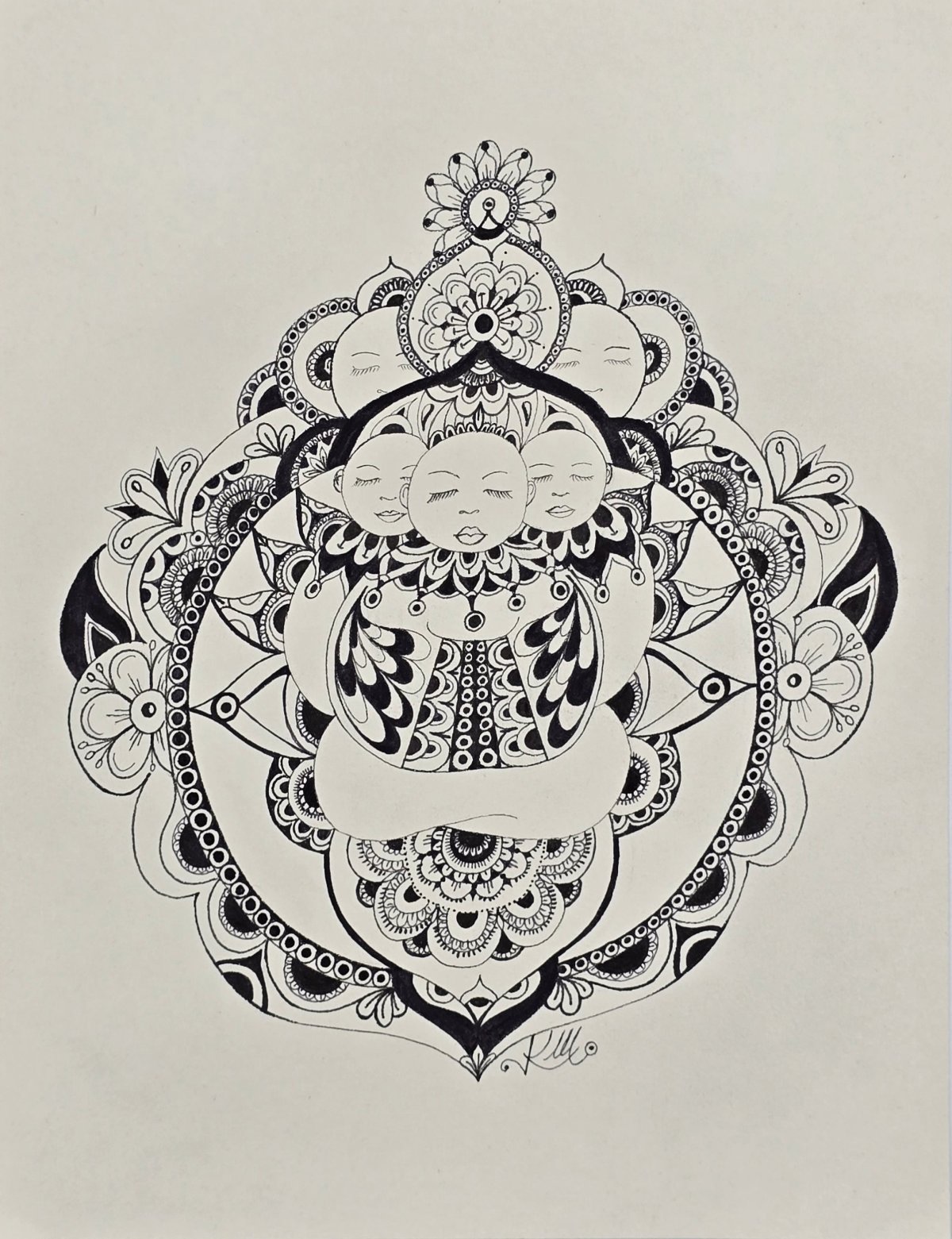 Cette oeuvre symbolique évoque la force de l'égrégore. L'univers de formes organiques et de motifs décoratifs qui se déploient autour du personnage central est une invitation à la paix, un instant d'équilibre dans une énergie vibrante révèlant en profondeur, harmonie et sérénité.