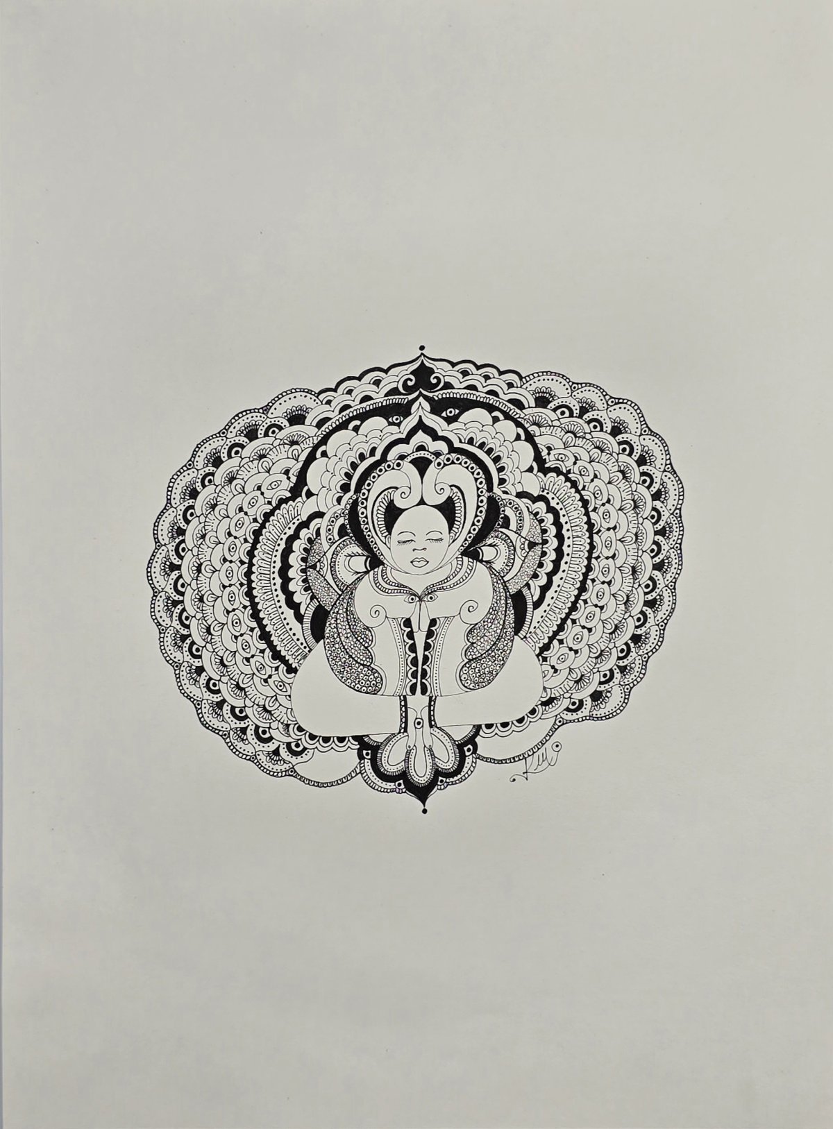 L'univers de formes organiques et de motifs décoratifs qui se déploient autour du personnage central est une invitation à la paix, un instant d'équilibre dans une énergie vibrante révèlant en profondeur, harmonie et sérénité.