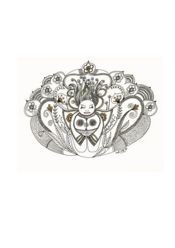 Laissez-vous imprégner par l'énergie de ce mandala, né d'une création à main levée. L'univers de formes organiques et de motifs décoratifs qui se déploient autour du personnage central est une invitation à la paix, un instant d'équilibre dans une énergie vibrante révélant en profondeur, harmonie et sérénité.
