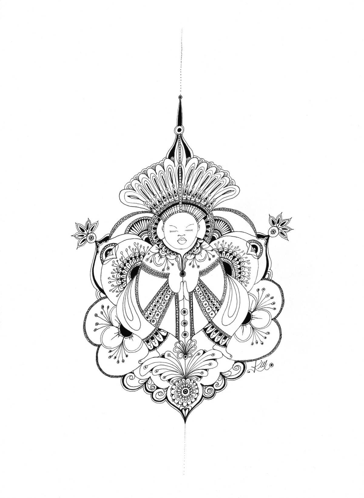 Laissez-vous imprégner par l'énergie de ce mandala, né d'une création à main levée. L'univers de formes organiques et de motifs décoratifs qui se déploient autour du personnage central est une invitation à la paix, un instant d'équilibre dans une énergie vibrante révélant en profondeur, harmonie et sérénité.