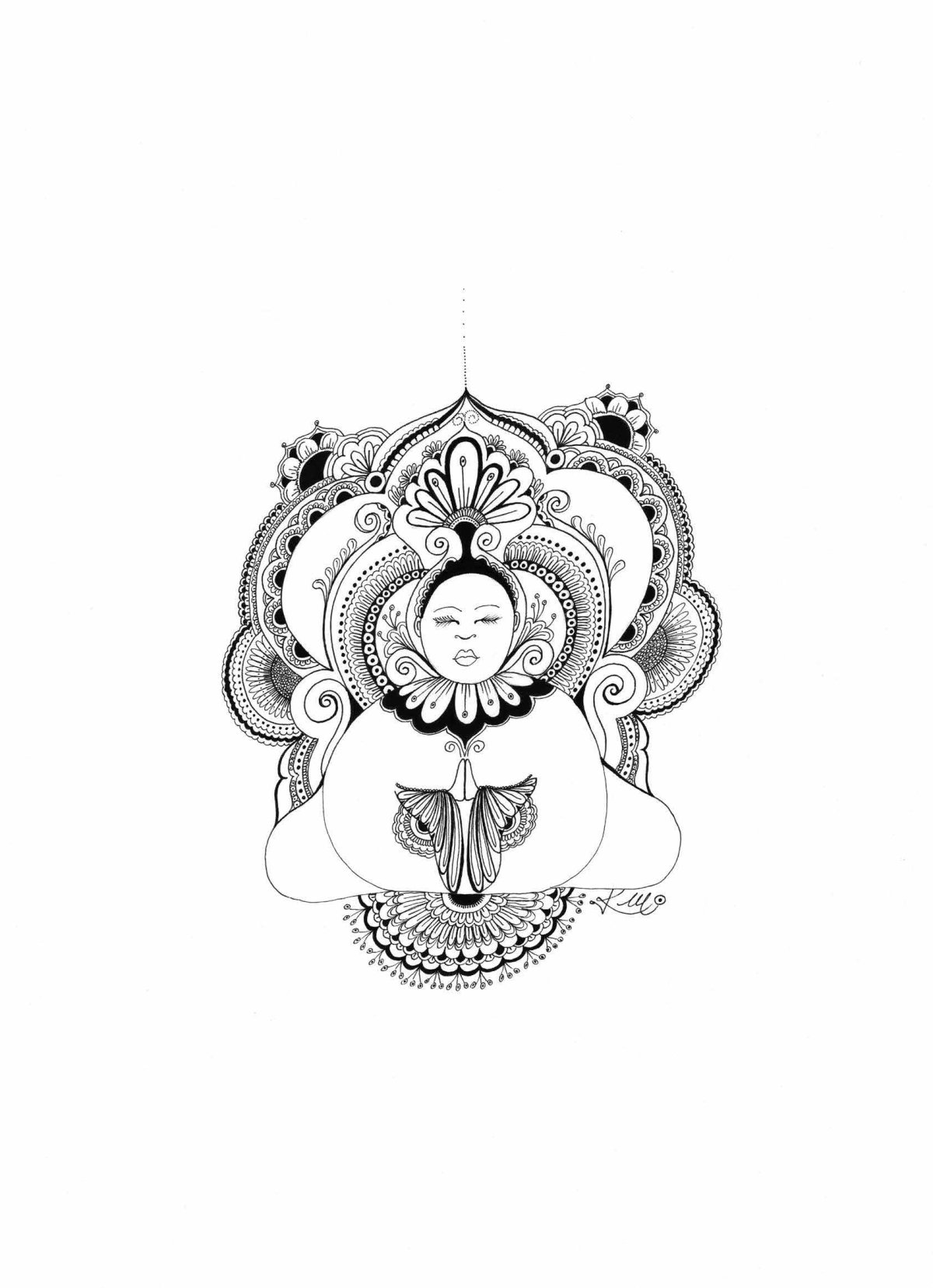 Laissez-vous imprégner par l'énergie de ce mandala, né d'une création à main levée. L'univers de formes organiques et de motifs décoratifs qui se déploient autour du personnage central est une invitation à la paix, un instant d'équilibre dans une énergie vibrante révélant en profondeur, harmonie et sérénité.