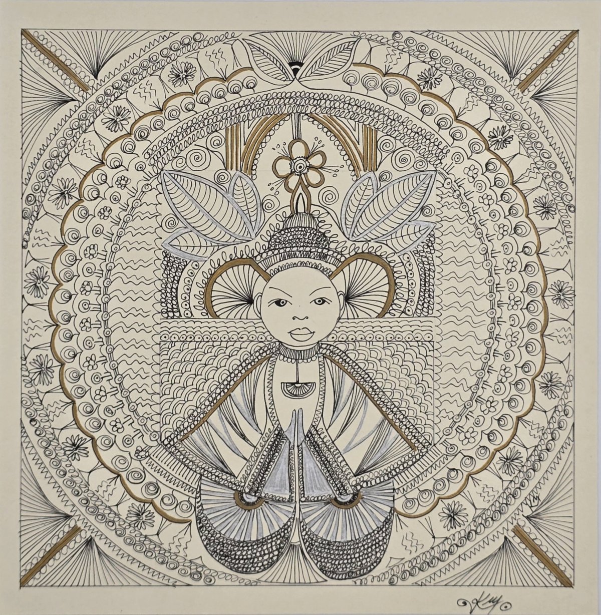 L'univers de formes organiques et de motifs décoratifs qui se déploient autour du personnage central est une invitation à la paix, un instant d'équilibre dans une énergie vibrante révèlant en profondeur, harmonie et sérénité.