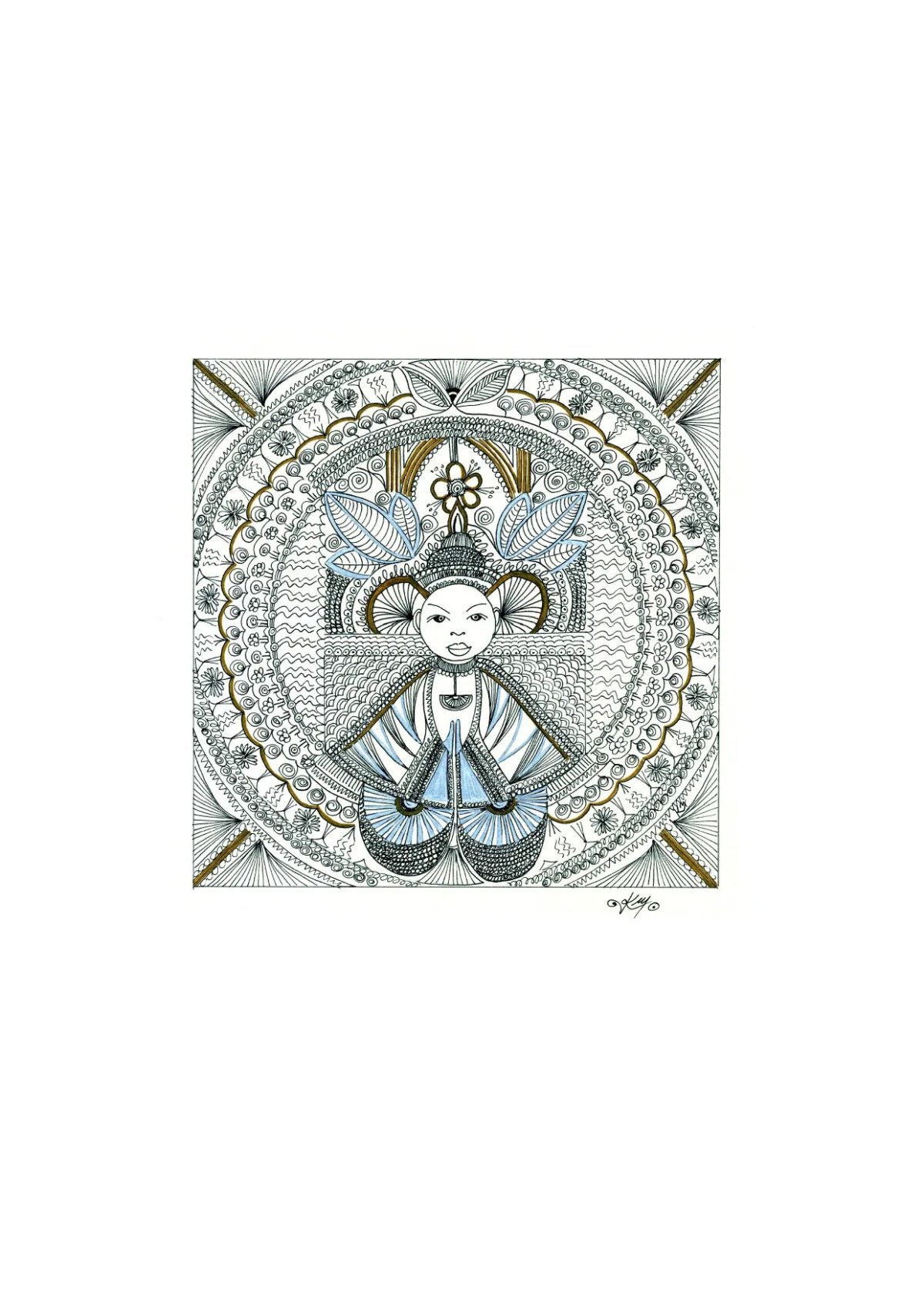 Laissez-vous imprégner par l'énergie de ce mandala, né d'une création à main levée. L'univers de formes organiques et de motifs décoratifs qui se déploient autour du personnage central est une invitation à la paix, un instant d'équilibre dans une énergie vibrante révélant en profondeur, harmonie et sérénité.