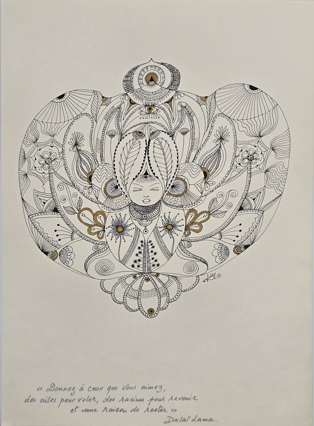 Cette oeuvre symbolise la libération et l'autonomisation. L'univers de formes organiques et de motifs décoratifs qui se déploient autour du personnage central est une invitation à la paix, un instant d'équilibre dans une énergie vibrante révèlant en profondeur, harmonie et sérénité.