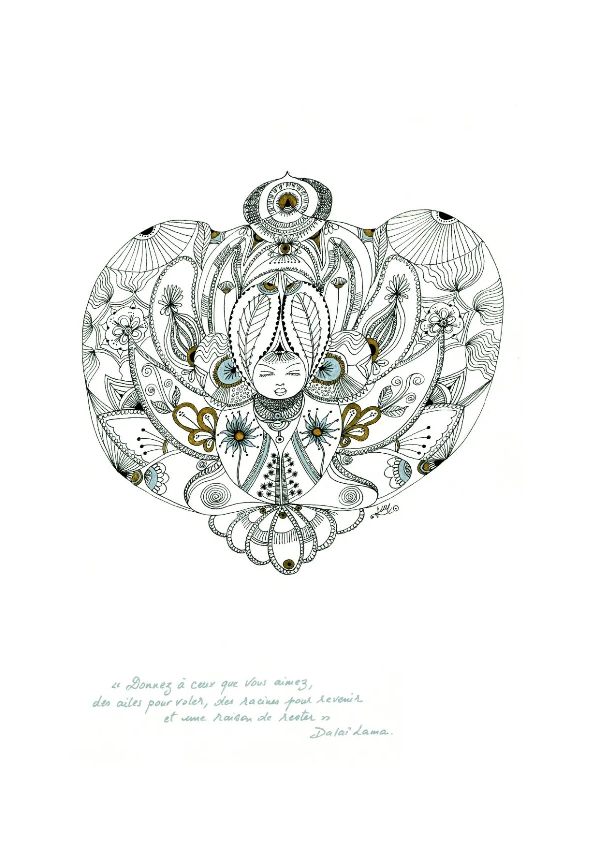 Laissez-vous imprégner par l'énergie de ce mandala, né d'une création à main levée. L'univers de formes organiques et de motifs décoratifs qui se déploient autour du personnage central est une invitation à la paix, un instant d'équilibre dans une énergie vibrante révélant en profondeur, harmonie et sérénité.