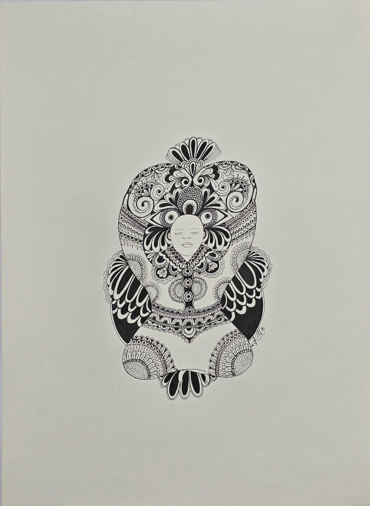 Cette oeuvre est une représentation symbolique à travers des formes organiques et des motifs décoratifs qui se déploient autour du personnage central. Elle incarne le thème de la guidance, de la protection, de la liberté et du lien avec la nature, invitant à la paix et l'harmonie.