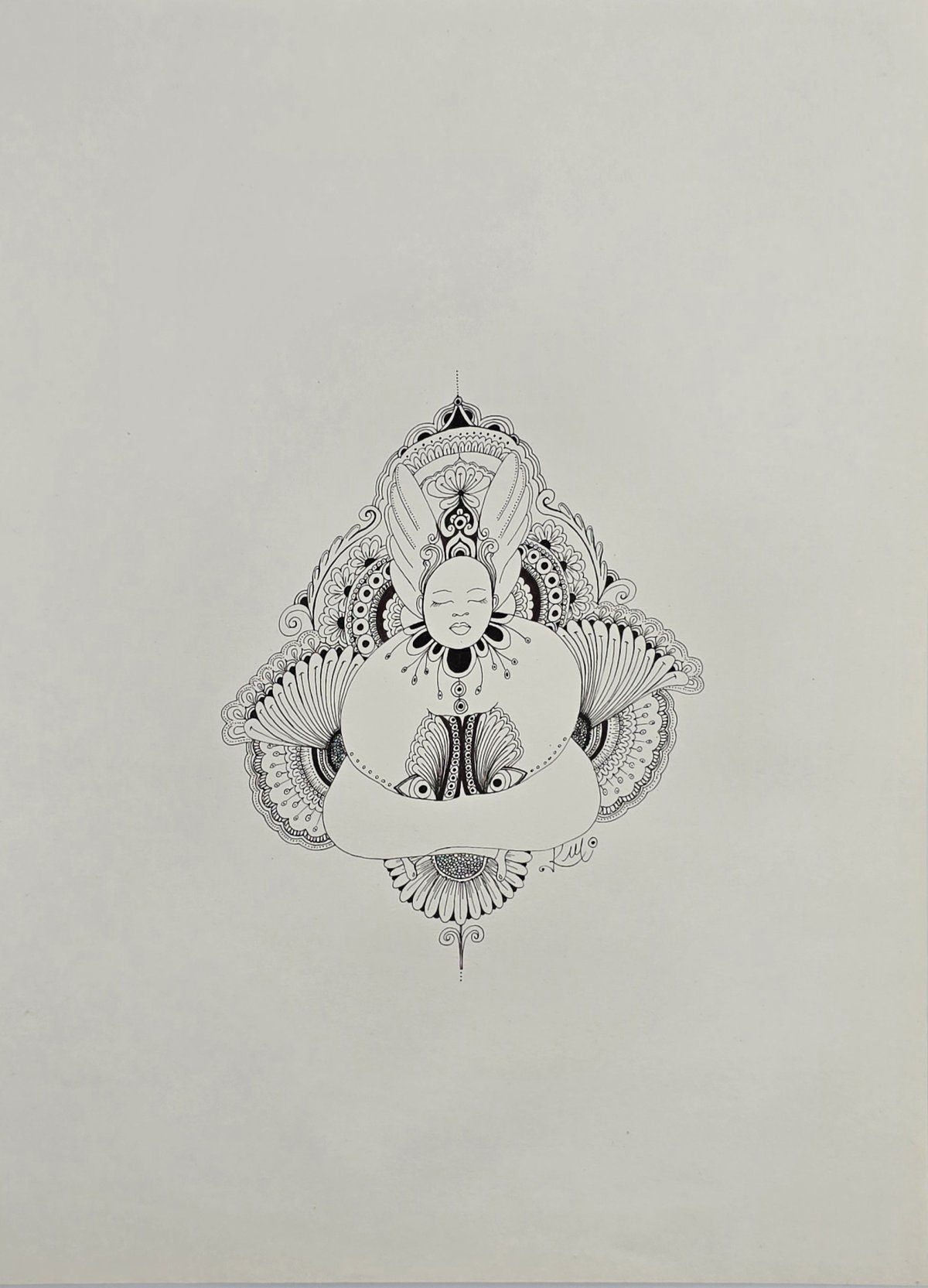 L'univers de formes organiques et de motifs décoratifs qui se déploient autour du personnage central est une invitation à la paix, un instant d'équilibre dans une énergie vibrante révélant en profondeur, harmonie et sérénité.