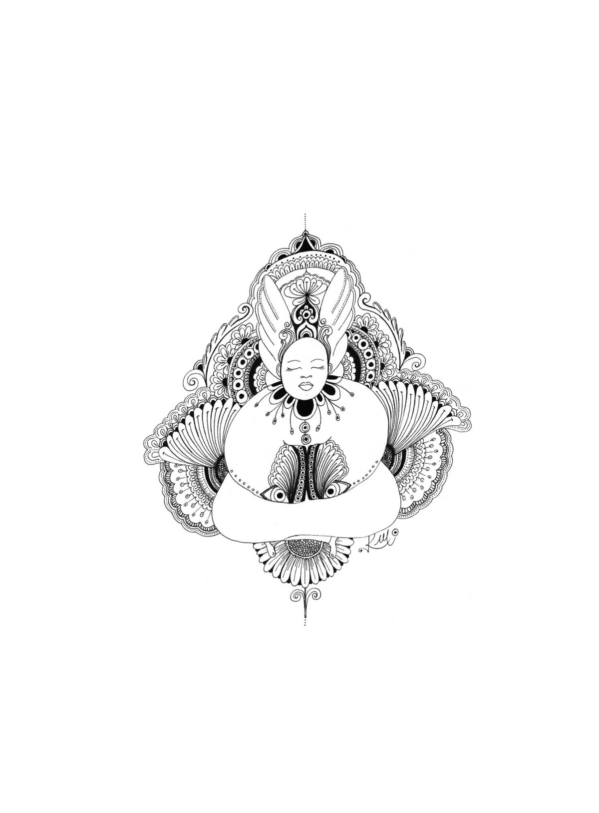 Laissez-vous imprégner par l'énergie de ce mandala, né d'une création à main levée. L'univers de formes organiques et de motifs décoratifs qui se déploient autour du personnage central est une invitation à la paix, un instant d'équilibre dans une énergie vibrante révélant en profondeur, harmonie et sérénité.