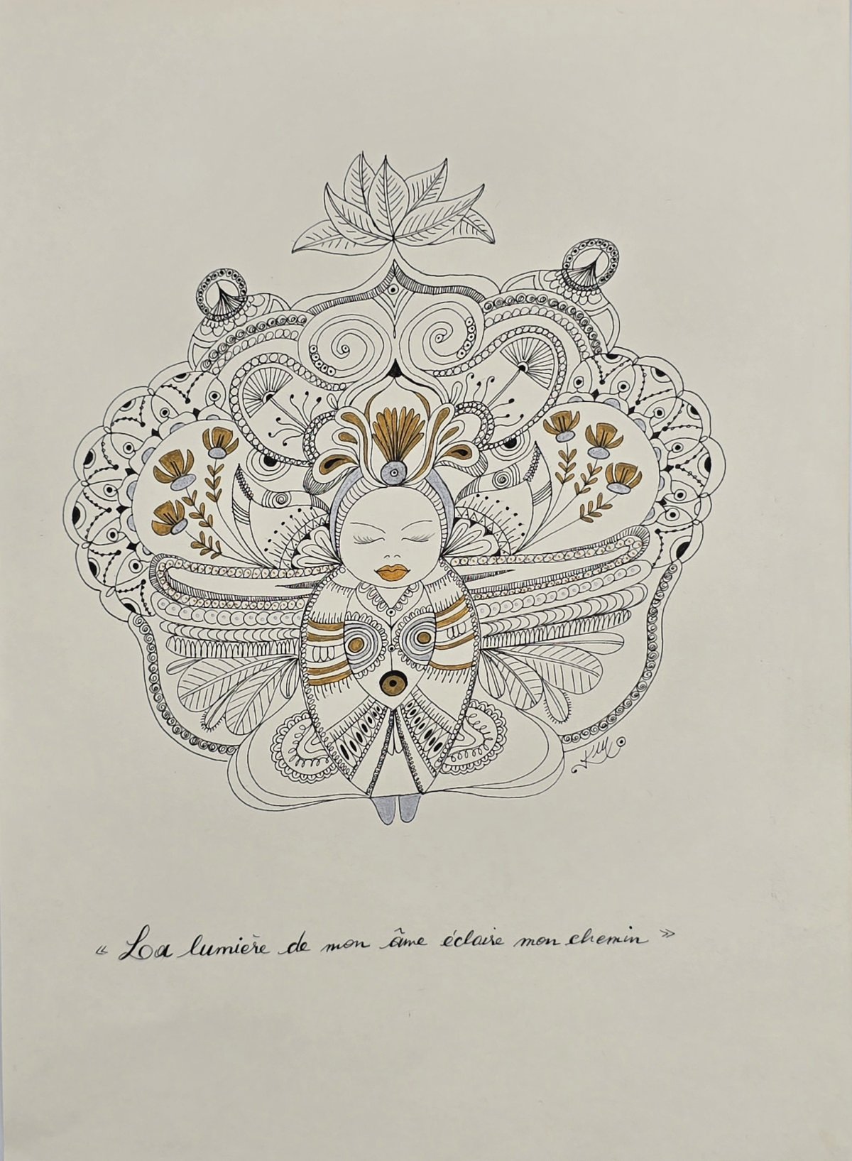 L'univers de formes organiques et de motifs décoratifs qui se déploient autour du personnage central est une invitation à la paix, un instant d'équilibre dans une énergie vibrante révèlant en profondeur, harmonie et sérénité. Cette oeuvre parle de la reliance à sa guidance et l'illumination à travers le retour à soi et la paix intérieure.