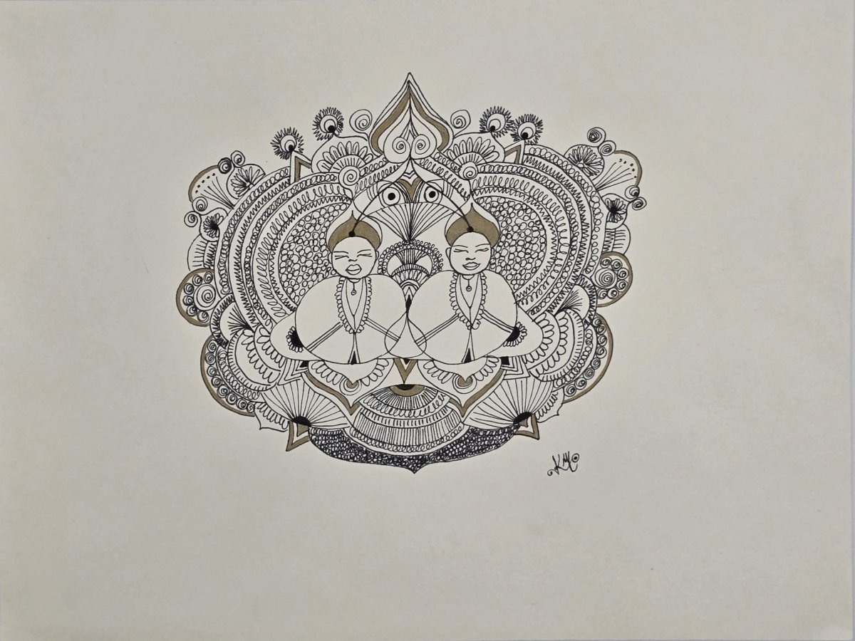 Cette oeuvre évoque la connexion, l'unité et la dualité harmonieuse. L'univers de formes organiques et de motifs décoratifs qui se déploient autour du personnage central est une invitation à la paix, un instant d'équilibre dans une énergie vibrante révélant en profondeur, harmonie et sérénité.