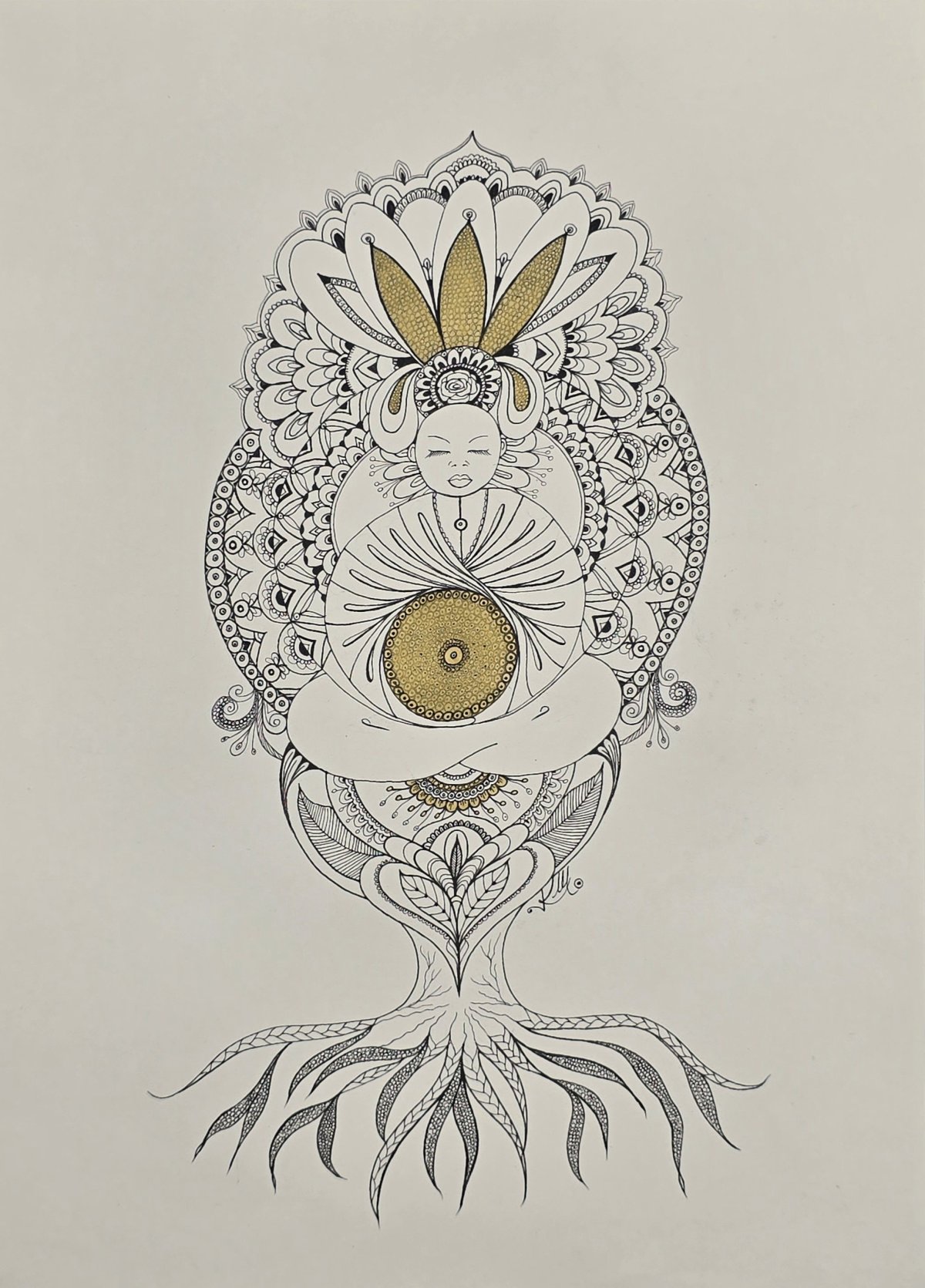 Cette oeuvre évoque la douceur, la tendresse, la connexion spirituelle et une profonde quiétude, symbolisant le sacré à travers la maternité. L'univers de formes organiques et de motifs décoratifs qui se déploient autour du personnage central est une invitation à la paix, un instant d'équilibre dans une énergie vibrante révèlant en profondeur, harmonie et sérénité.