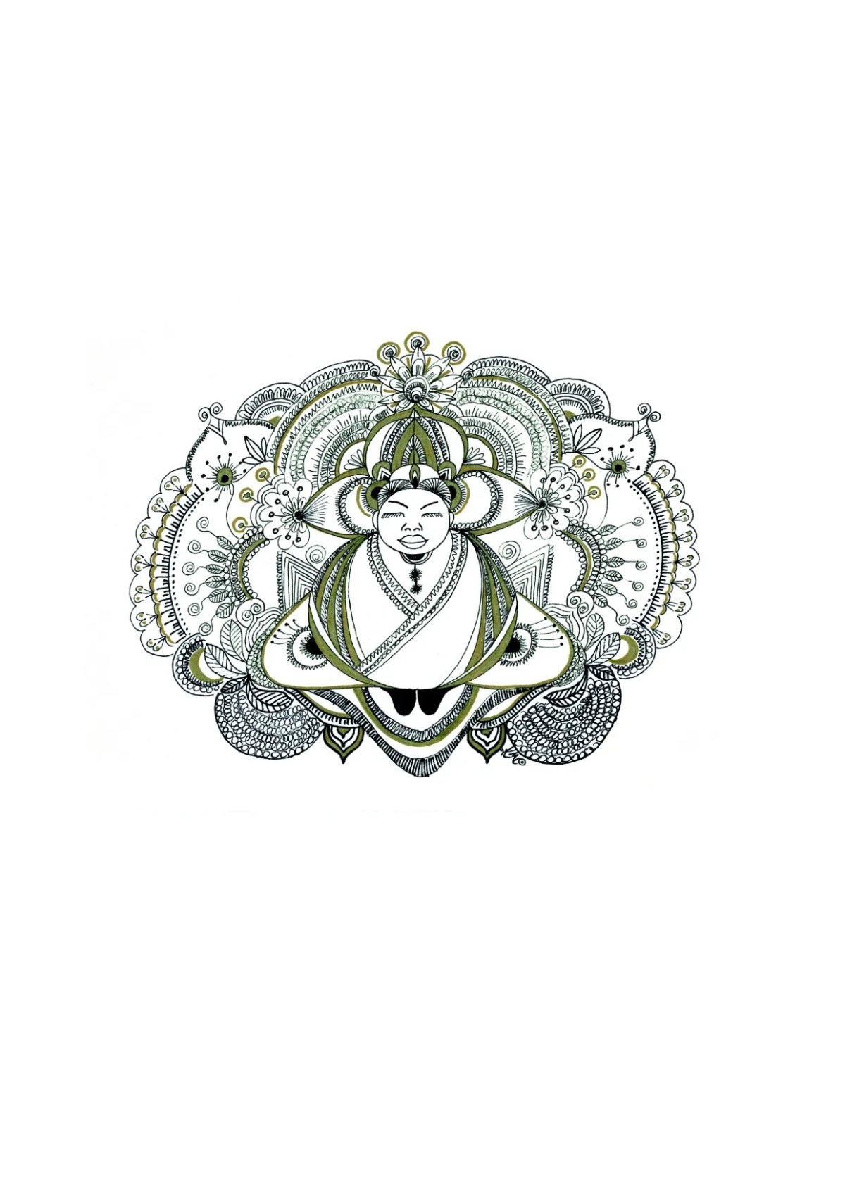 Laissez-vous imprégner par l'énergie de ce mandala, né d'une création à main levée. L'univers de formes organiques et de motifs décoratifs qui se déploient autour du personnage central est une invitation à la paix, un instant d'équilibre dans une énergie vibrante révélant en profondeur, harmonie et sérénité.