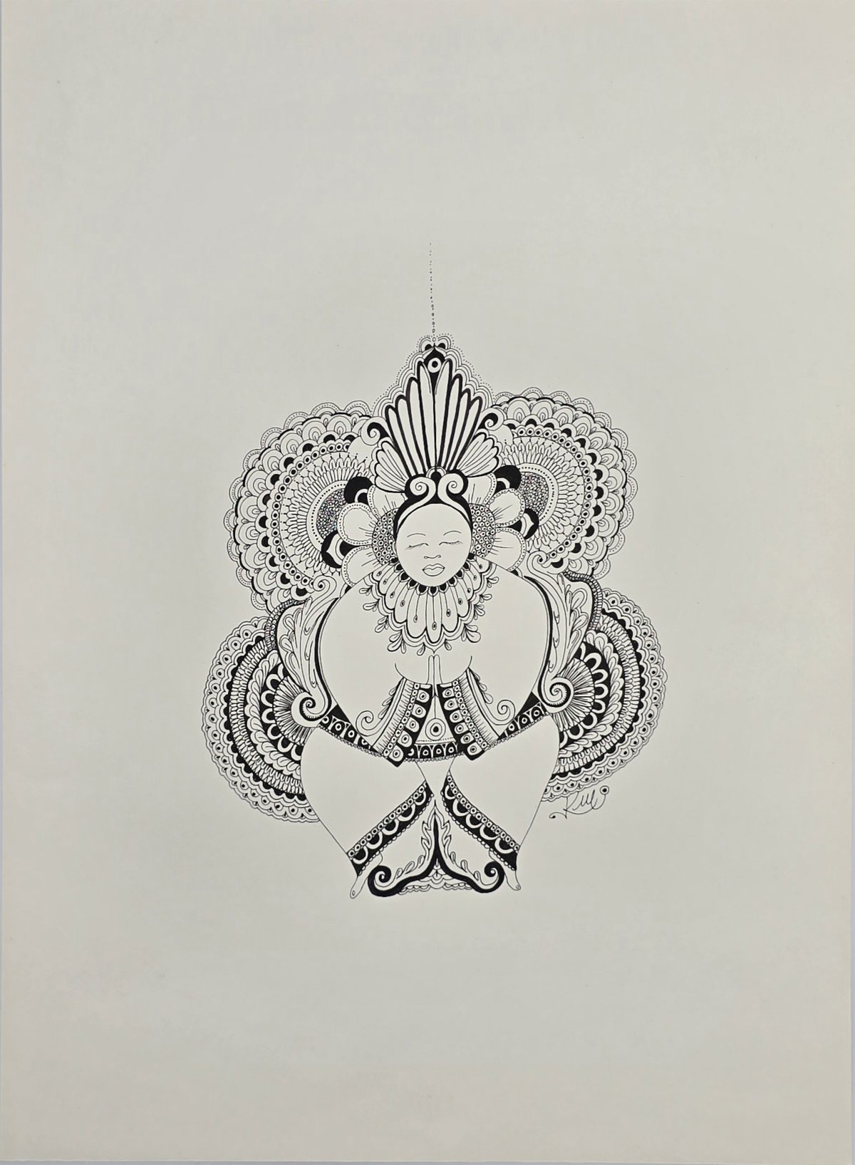 L'univers de formes organiques et de motifs décoratifs qui se déploient autour du personnage central est une invitation à la paix, un instant d'équilibre dans une énergie vibrante révèlant en profondeur, harmonie et sérénité. Les mains jointes dans un geste de recueillement renforce la symbolique du rituel et du sacré.