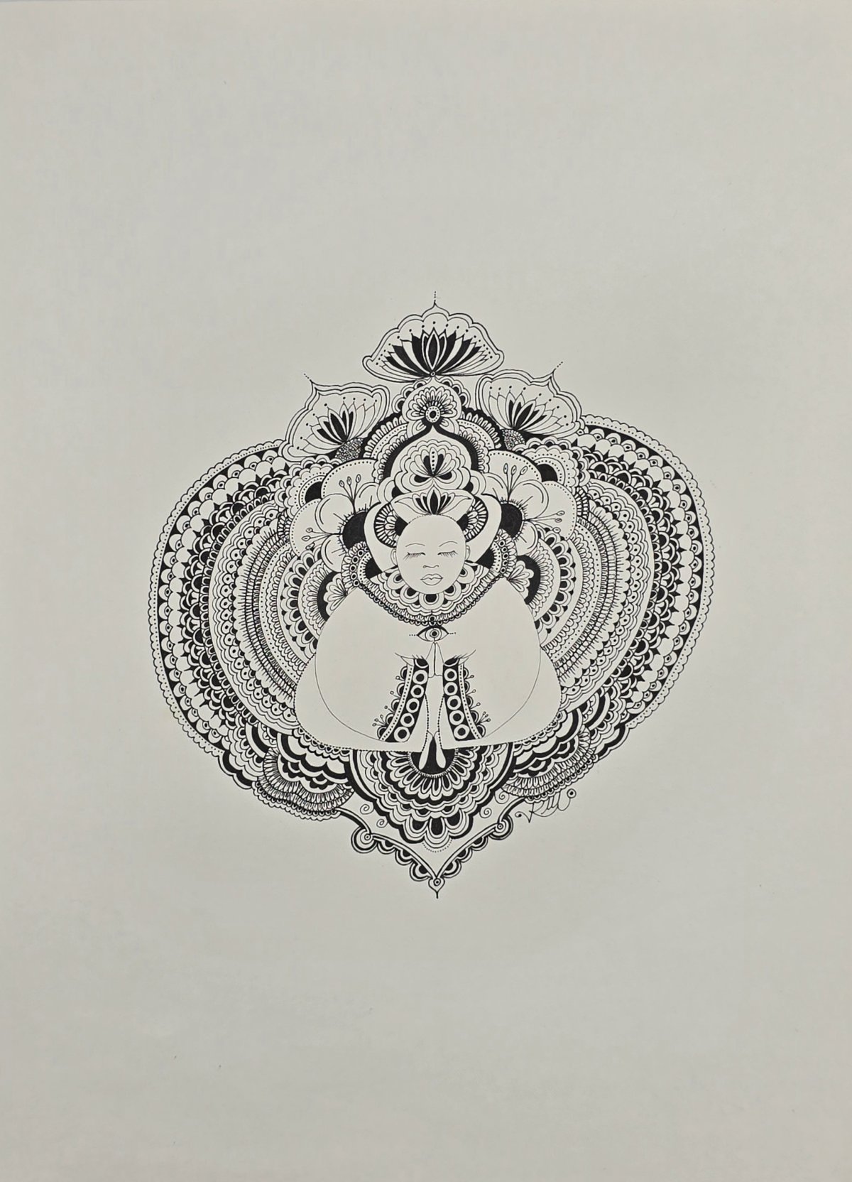 L'univers de formes organiques et de motifs décoratifs qui se déploient autour du personnage central est une invitation à la paix, un instant d'équilibre dans une énergie vibrante révélant en profondeur, harmonie et sérénité.