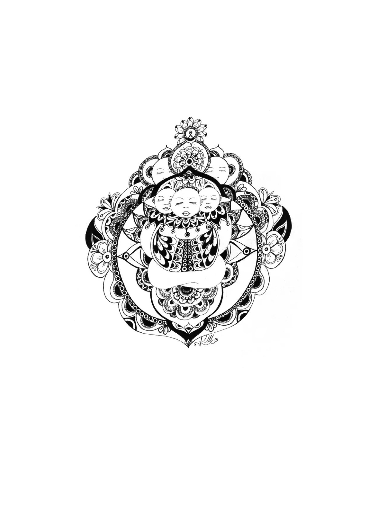 Laissez-vous imprégner par l'énergie de ce mandala, né d'une création à main levée. L'univers de formes organiques et de motifs décoratifs qui se déploient autour du personnage central est une invitation à la paix, un instant d'équilibre dans une énergie vibrante révélant en profondeur, harmonie et sérénité.